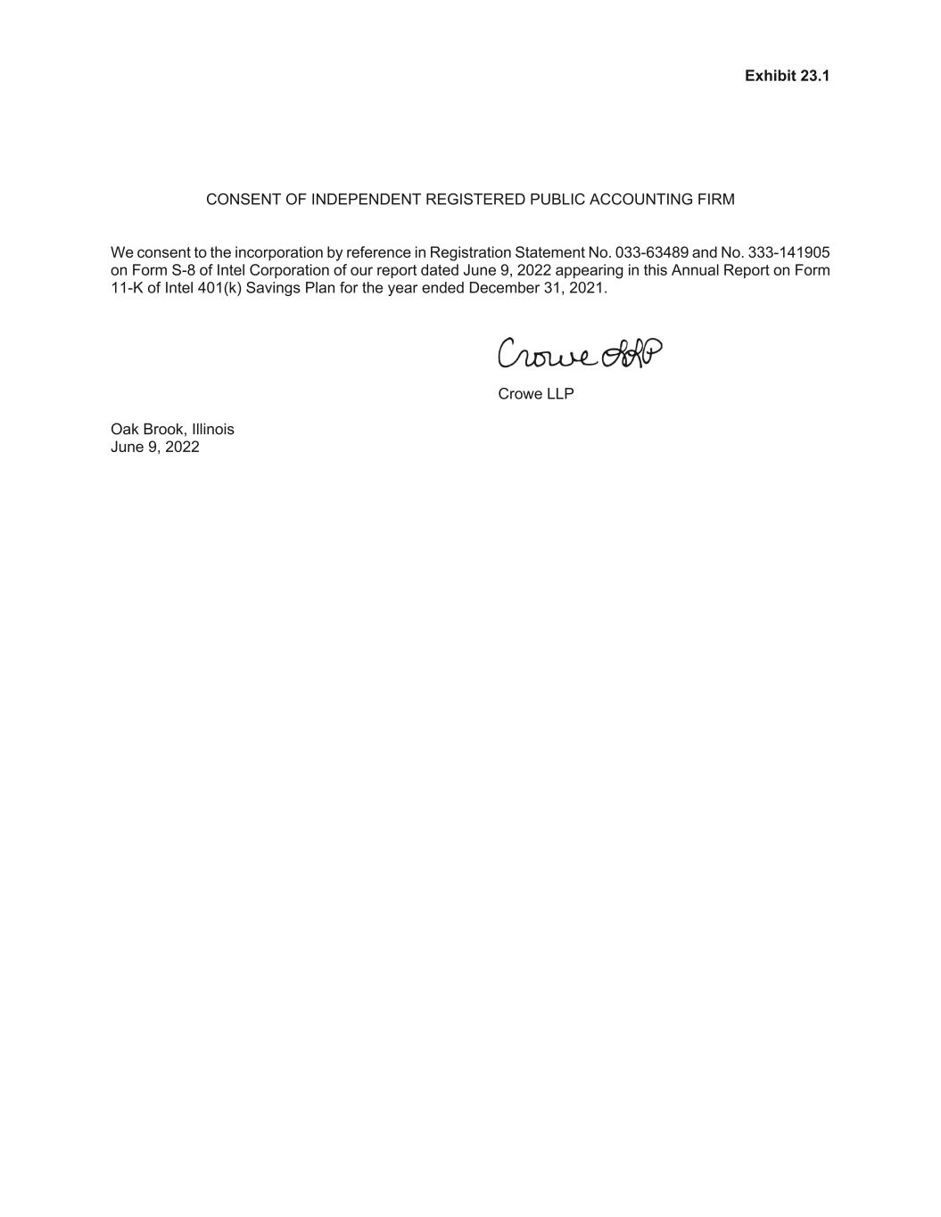 Exhibit 23.1 CONSENT OF INDEPENDENT REGISTERED PUBLIC ACCOUNTING FIRM We consent to the incorporation by reference in Registration Statement No. 033-63489 and No. 333-141905 on Form S-8 of Intel Corporation of our report dated June 9, 2022 appearing in this Annual Report on Form 11-K of Intel 401(k) Savings Plan for the year ended December 31, 2021. Crowe LLP Oak Brook, Illinois June 9, 2022