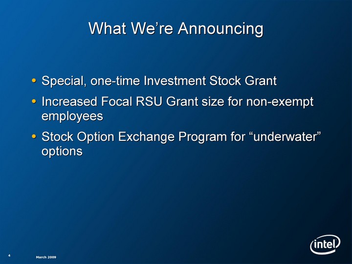 | 3 Current Environment Intel continuing to focus on efficiency during downturn Sustaining investments in our technology and products Today: investing further in you |