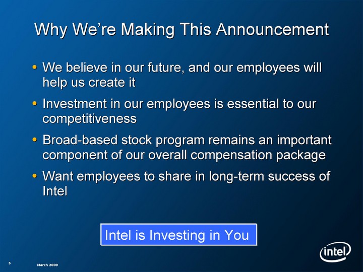 | 5 Why We're Making This Announcement We believe in our future, and our employees will help us create it Investment in our employees is essential to our competitiveness Broad-based stock program remains an important component of our overall compensation package Want employees to share in long-term success of Intel Intel is Investing in You |