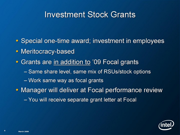 | 6 Investment Stock Grants Special one-time award; investment in employees Meritocracy-based Grants are in addition to '09 Focal grants Same share level, same mix of RSUs/stock options Work same way as focal grants Manager will deliver at Focal performance review You will receive separate grant letter at Focal |