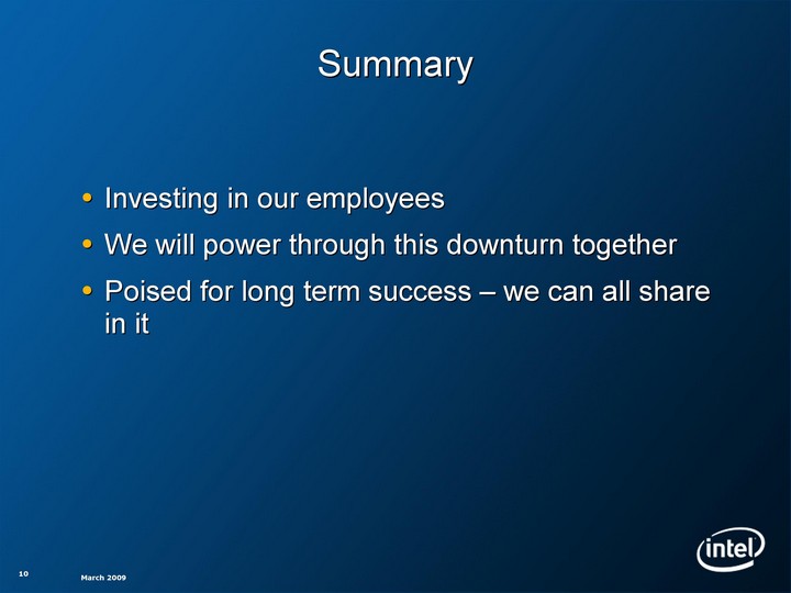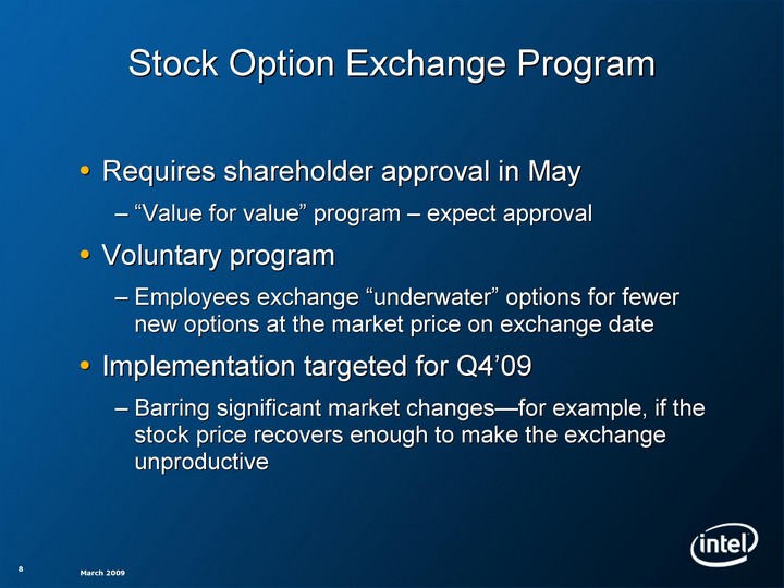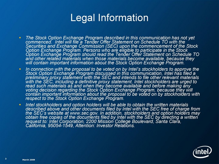 Legal Information The Stock Option Exchange Program described in this communication has not yet commenced. Intel will file a Tender Offer Statement on Schedule TO with the Securities and Exchange Commission (SEC) upon the commencement of the Stock Option Exchange Program. Persons who are eligible to participate in the Stock Option Exchange Program should read the Tender Offer Statement on Schedule TO and other related materials when those materials become available, because they will contain important information about the Stock Option Exchange Program. In connection with the proposal to be voted on by Intel's stockholders to approve the Stock Option Exchange Program discussed in this communication, Intel has filed a preliminary proxy statement with the SEC and intends to file other relevant materials with the SEC, including a definitive proxy statement. Intel stockholders are urged to read such materials as and when they become available and before making any voting decision regarding the Stock Option Exchange Program, because they will contain important information about the proposal to be voted on by stockholders with respect to the Stock Option Exchange Program. Intel stockholders and option holders will be able to obtain the written materials described above and other documents filed by Intel with the SEC free of charge from the SEC's website at www.sec.gov. In addition, stockholders and option holders may obtain free copies of the documents filed by Intel with the SEC by directing a written request to: Intel Corporation, 2200 Mission College Boulevard, Santa Clara, California, 95054-1549, Attention: Investor Relations. 2
