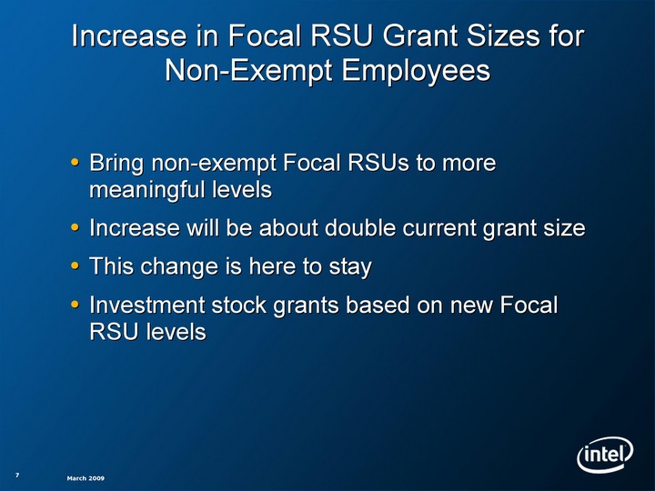 6 Investment Stock Grants Special one-time award; investment in employees Meritocracy-based Grants are in addition to '09 Focal grants Same share level, same mix of RSUs/stock options Work same way as focal grants Manager will deliver at Focal performance review You will receive separate grant letter at Focal