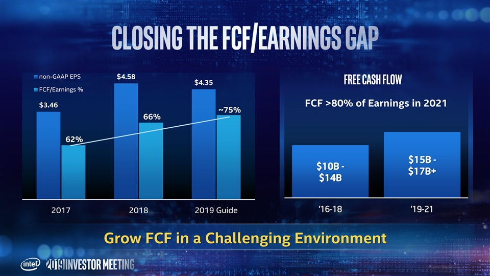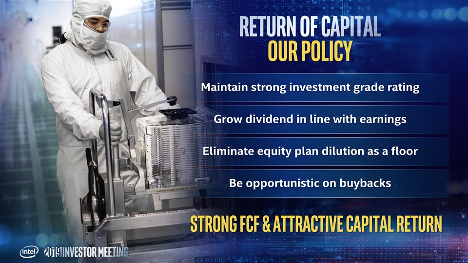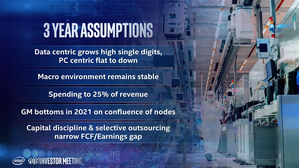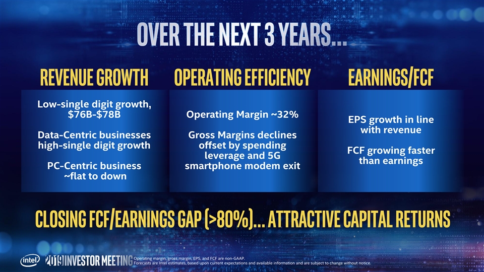 Revenue growth Operating efficiency Earnings/FCF Low-single digit growth, $76B-$78B Operating Margin ~32% EPS growth in line with revenue Data-Centric businesses Gross Margins declines high-single digit growth offset by spending FCF growing faster leverage and 5G than earnings PC-Centric business smartphone modem exit ~flat to down Closing FCF/Earnings gap (>80%)… ATTRACTIVE capital RETURNS Operating margin, gross margin, EPS, and FCF are non-GAAP. Forecasts are Intel estimates, based upon current expectations and available information and are subject to change without notice.Revenue growth Operating efficiency Earnings/FCF Low-single digit growth, $76B-$78B Operating Margin ~32% EPS growth in line with revenue Data-Centric businesses Gross Margins declines high-single digit growth offset by spending FCF growing faster leverage and 5G than earnings PC-Centric business smartphone modem exit ~flat to down Closing FCF/Earnings gap (>80%)… ATTRACTIVE capital RETURNS Operating margin, gross margin, EPS, and FCF are non-GAAP. Forecasts are Intel estimates, based upon current expectations and available information and are subject to change without notice.