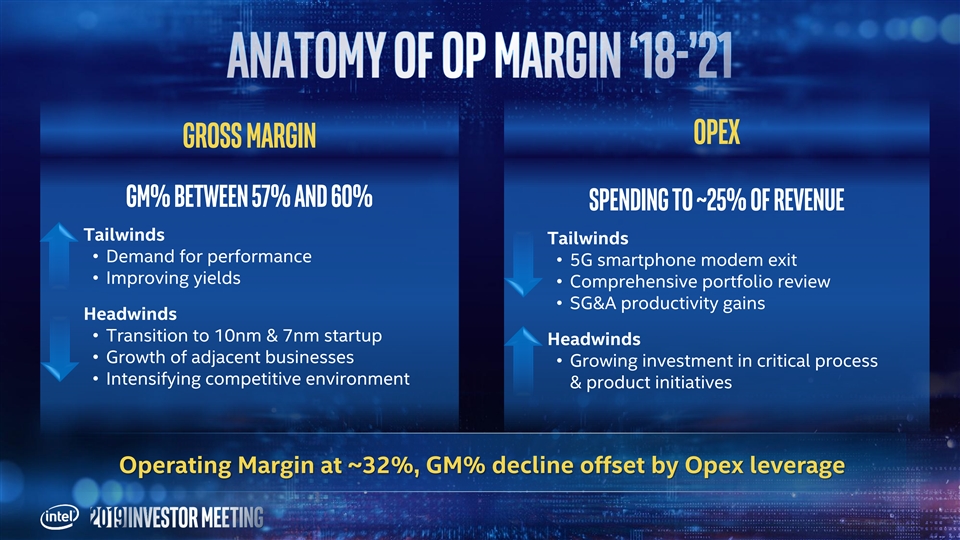 Opex Gross Margin GM% between 57% and 60% Spending to ~25% of revenue Tailwinds Tailwinds • Demand for performance • 5G smartphone modem exit • Improving yields • Comprehensive portfolio review • SG&A productivity gains Headwinds • Transition to 10nm & 7nm startup Headwinds • Growth of adjacent businesses • Growing investment in critical process • Intensifying competitive environment & product initiatives Operating Margin at ~32%, GM% decline offset by Opex leverage Opex Gross Margin GM% between 57% and 60% Spending to ~25% of revenue Tailwinds Tailwinds • Demand for performance • 5G smartphone modem exit • Improving yields • Comprehensive portfolio review • SG&A productivity gains Headwinds • Transition to 10nm & 7nm startup Headwinds • Growth of adjacent businesses • Growing investment in critical process • Intensifying competitive environment & product initiatives Operating Margin at ~32%, GM% decline offset by Opex leverage