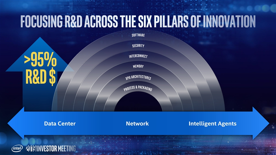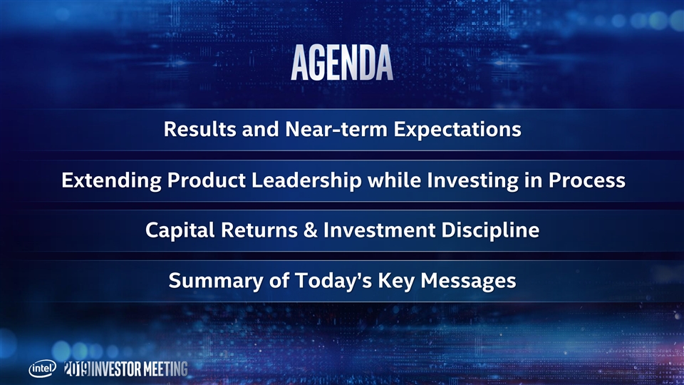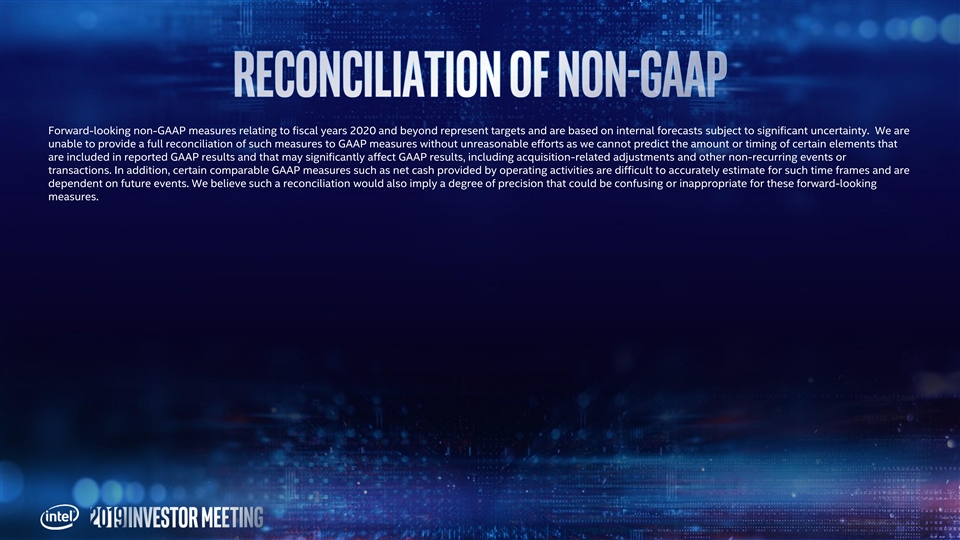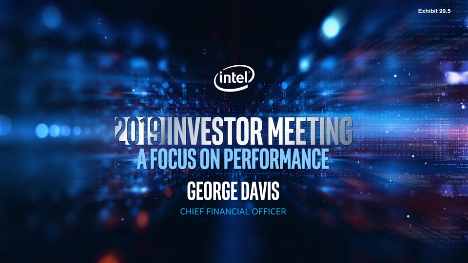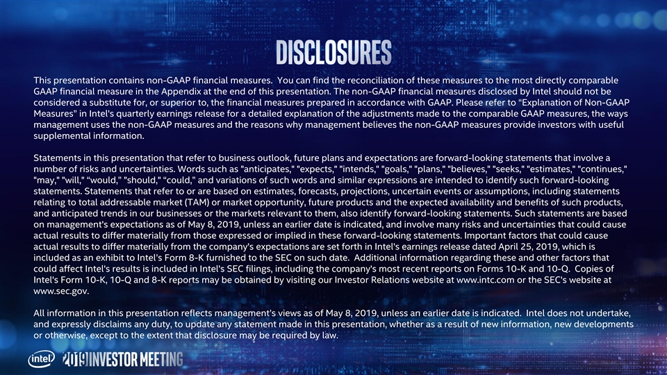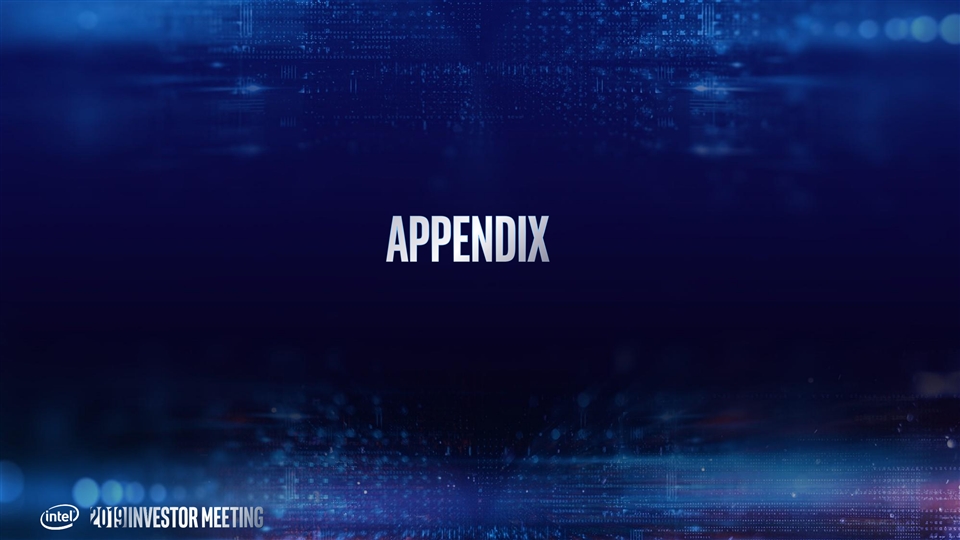 This presentation contains non-GAAP financial measures. You can find the reconciliation of these measures to the most directly comparable GAAP financial measure in the Appendix at the end of this presentation. The non-GAAP financial measures disclosed by Intel should not be considered a substitute for, or superior to, the financial measures prepared in accordance with GAAP. Please refer to “Explanation of Non-GAAP Measures” in Intel's quarterly earnings release for a detailed explanation of the adjustments made to the comparable GAAP measures, the ways management uses the non-GAAP measures and the reasons why management believes the non-GAAP measures provide investors with useful supplemental information. Statements in this presentation that refer to business outlook, future plans and expectations are forward-looking statements that involve a number of risks and uncertainties. Words such as anticipates, expects, intends, goals, plans, believes, seeks, estimates, continues, may, will, “would,” should, “could,” and variations of such words and similar expressions are intended to identify such forward-looking statements. Statements that refer to or are based on estimates, forecasts, projections, uncertain events or assumptions, including statements relating to total addressable market (TAM) or market opportunity, future products and the expected availability and benefits of such products, and anticipated trends in our businesses or the markets relevant to them, also identify forward-looking statements. Such statements are based on management's expectations as of May 8, 2019, unless an earlier date is indicated, and involve many risks and uncertainties that could cause actual results to differ materially from those expressed or implied in these forward-looking statements. Important factors that could cause actual results to differ materially from the company's expectations are set forth in Intel's earnings release dated April 25, 2019, which is included as an exhibit to Intel’s Form 8-K furnished to the SEC on such date. Additional information regarding these and other factors that could affect Intel's results is included in Intel's SEC filings, including the company's most recent reports on Forms 10-K and 10-Q. Copies of Intel's Form 10-K, 10-Q and 8-K reports may be obtained by visiting our Investor Relations website at www.intc.com or the SEC's website at www.sec.gov. All information in this presentation reflects management’s views as of May 8, 2019, unless an earlier date is indicated. Intel does not undertake, and expressly disclaims any duty, to update any statement made in this presentation, whether as a result of new information, new developments or otherwise, except to the extent that disclosure may be required by law.This presentation contains non-GAAP financial measures. You can find the reconciliation of these measures to the most directly comparable GAAP financial measure in the Appendix at the end of this presentation. The non-GAAP financial measures disclosed by Intel should not be considered a substitute for, or superior to, the financial measures prepared in accordance with GAAP. Please refer to “Explanation of Non-GAAP Measures” in Intel's quarterly earnings release for a detailed explanation of the adjustments made to the comparable GAAP measures, the ways management uses the non-GAAP measures and the reasons why management believes the non-GAAP measures provide investors with useful supplemental information. Statements in this presentation that refer to business outlook, future plans and expectations are forward-looking statements that involve a number of risks and uncertainties. Words such as anticipates, expects, intends, goals, plans, believes, seeks, estimates, continues, may, will, “would,” should, “could,” and variations of such words and similar expressions are intended to identify such forward-looking statements. Statements that refer to or are based on estimates, forecasts, projections, uncertain events or assumptions, including statements relating to total addressable market (TAM) or market opportunity, future products and the expected availability and benefits of such products, and anticipated trends in our businesses or the markets relevant to them, also identify forward-looking statements. Such statements are based on management's expectations as of May 8, 2019, unless an earlier date is indicated, and involve many risks and uncertainties that could cause actual results to differ materially from those expressed or implied in these forward-looking statements. Important factors that could cause actual results to differ materially from the company's expectations are set forth in Intel's earnings release dated April 25, 2019, which is included as an exhibit to Intel’s Form 8-K furnished to the SEC on such date. Additional information regarding these and other factors that could affect Intel's results is included in Intel's SEC filings, including the company's most recent reports on Forms 10-K and 10-Q. Copies of Intel's Form 10-K, 10-Q and 8-K reports may be obtained by visiting our Investor Relations website at www.intc.com or the SEC's website at www.sec.gov. All information in this presentation reflects management’s views as of May 8, 2019, unless an earlier date is indicated. Intel does not undertake, and expressly disclaims any duty, to update any statement made in this presentation, whether as a result of new information, new developments or otherwise, except to the extent that disclosure may be required by law.
