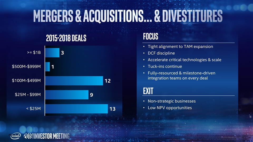 Focus 2015-2018 Deals • Tight alignment to TAM expansion >= $1B 3• DCF discipline • Accelerate critical technologies & scale $500M-$999M• Tuck-ins continue 1 • Fully-resourced & milestone-driven integration teams on every deal $100M-$499M 12 Exit $25M - $99M 9 • Non-strategic businesses • Low NPV opportunities < $25M 13 All dealsFocus 2015-2018 Deals • Tight alignment to TAM expansion >= $1B 3• DCF discipline • Accelerate critical technologies & scale $500M-$999M• Tuck-ins continue 1 • Fully-resourced & milestone-driven integration teams on every deal $100M-$499M 12 Exit $25M - $99M 9 • Non-strategic businesses • Low NPV opportunities < $25M 13 All deals