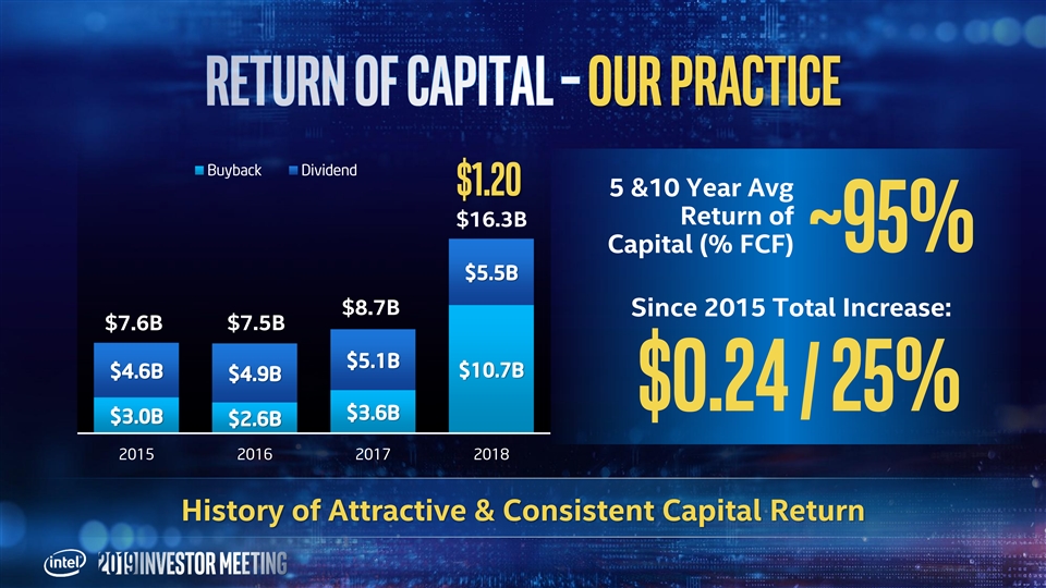our practice Buyback Dividend $1.20 5 &10 Year Avg Return of $16.3B ~95% Capital (% FCF) $5.5B $8.7B Since 2015 Total Increase: $7.6B $7.5B $5.1B $10.7B $4.6B $4.9B $0.24 / 25% $3.6B $3.0B $2.6B 2015 2016 2017 2018 History of Attractive & Consistent Capital Returnour practice Buyback Dividend $1.20 5 &10 Year Avg Return of $16.3B ~95% Capital (% FCF) $5.5B $8.7B Since 2015 Total Increase: $7.6B $7.5B $5.1B $10.7B $4.6B $4.9B $0.24 / 25% $3.6B $3.0B $2.6B 2015 2016 2017 2018 History of Attractive & Consistent Capital Return