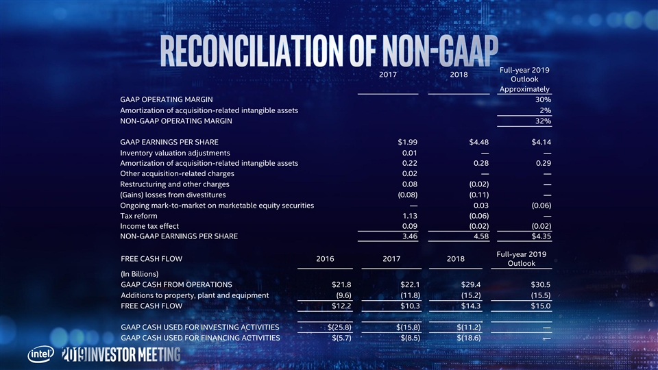 Full-year 2019 2017 2018 Outlook Approximately GAAP OPERATING MARGIN 30% Amortization of acquisition-related intangible assets 2% NON-GAAP OPERATING MARGIN 32% GAAP EARNINGS PER SHARE $1.99 $4.48 $4.14 Inventory valuation adjustments 0.01 — — Amortization of acquisition-related intangible assets 0.22 0.28 0.29 Other acquisition-related charges 0.02 — — Restructuring and other charges 0.08 (0.02) — (Gains) losses from divestitures (0.08) (0.11) — Ongoing mark-to-market on marketable equity securities — 0.03 (0.06) Tax reform 1.13 (0.06) — Income tax effect 0.09 (0.02) (0.02) NON-GAAP EARNINGS PER SHARE 3.46 4.58 $4.35 Full-year 2019 FREE CASH FLOW 2016 2017 2018 Outlook (In Billions) GAAP CASH FROM OPERATIONS $21.8 $22.1 $29.4 $30.5 Additions to property, plant and equipment (9.6) (11.8) (15.2) (15.5) FREE CASH FLOW $12.2 $10.3 $14.3 $15.0 GAAP CASH USED FOR INVESTING ACTIVITIES $(25.8) $(15.8) $(11.2) — GAAP CASH USED FOR FINANCING ACTIVITIES $(5.7) $(8.5) $(18.6) —Full-year 2019 2017 2018 Outlook Approximately GAAP OPERATING MARGIN 30% Amortization of acquisition-related intangible assets 2% NON-GAAP OPERATING MARGIN 32% GAAP EARNINGS PER SHARE $1.99 $4.48 $4.14 Inventory valuation adjustments 0.01 — — Amortization of acquisition-related intangible assets 0.22 0.28 0.29 Other acquisition-related charges 0.02 — — Restructuring and other charges 0.08 (0.02) — (Gains) losses from divestitures (0.08) (0.11) — Ongoing mark-to-market on marketable equity securities — 0.03 (0.06) Tax reform 1.13 (0.06) — Income tax effect 0.09 (0.02) (0.02) NON-GAAP EARNINGS PER SHARE 3.46 4.58 $4.35 Full-year 2019 FREE CASH FLOW 2016 2017 2018 Outlook (In Billions) GAAP CASH FROM OPERATIONS $21.8 $22.1 $29.4 $30.5 Additions to property, plant and equipment (9.6) (11.8) (15.2) (15.5) FREE CASH FLOW $12.2 $10.3 $14.3 $15.0 GAAP CASH USED FOR INVESTING ACTIVITIES $(25.8) $(15.8) $(11.2) — GAAP CASH USED FOR FINANCING ACTIVITIES $(5.7) $(8.5) $(18.6) —