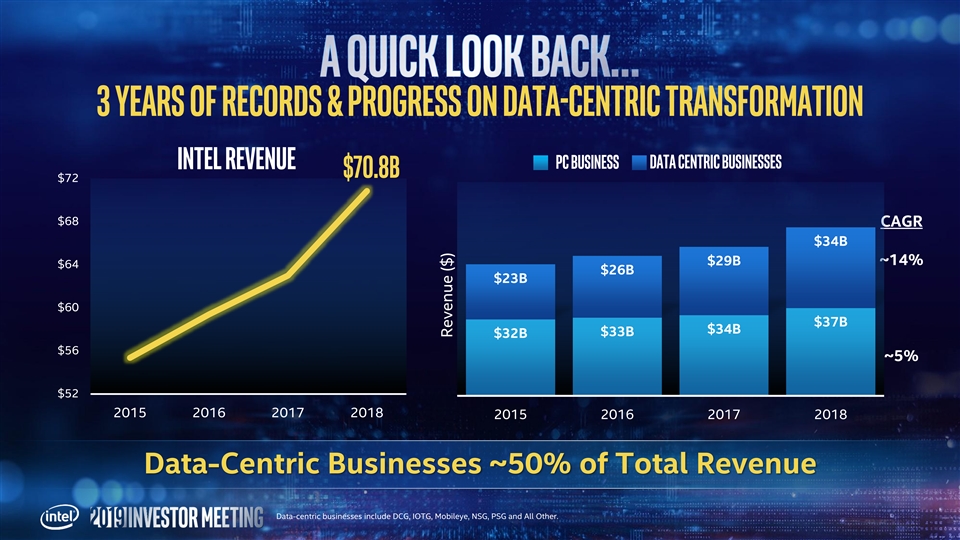 3 Years of Records & PROGRESS ON DATA-CENTRIC TRANSFORMATION Intel Revenue PC Business Data Centric Businesses $70.8B $72 $68 CAGR $34B $29B ~14% $64 $26B $23B $60 $37B $34B $33B $32B $56 ~5% $52 2015 2016 2017 2018 2015 2016 2017 2018 Data-Centric Businesses ~50% of Total Revenue Data-centric businesses include DCG, IOTG, Mobileye, NSG, PSG and All Other. Revenue ($)3 Years of Records & PROGRESS ON DATA-CENTRIC TRANSFORMATION Intel Revenue PC Business Data Centric Businesses $70.8B $72 $68 CAGR $34B $29B ~14% $64 $26B $23B $60 $37B $34B $33B $32B $56 ~5% $52 2015 2016 2017 2018 2015 2016 2017 2018 Data-Centric Businesses ~50% of Total Revenue Data-centric businesses include DCG, IOTG, Mobileye, NSG, PSG and All Other. Revenue ($)