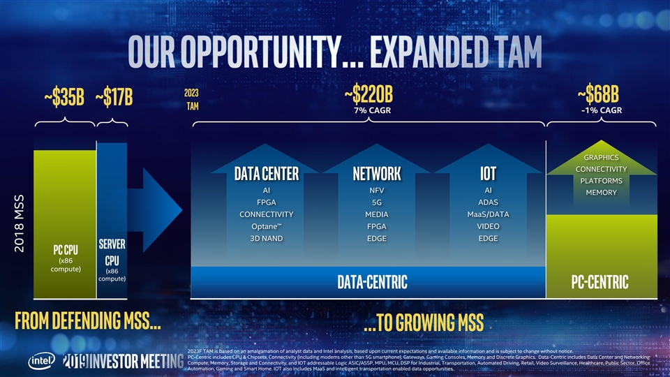 2023 ~$220B ~$68B ~$35B ~$17b TAM 7% CAGR -1% CAGR GRAPHICS CONNECTIVITY Data center NETWORK IOT PLATFORMS AI AI NFV MEMORY FPGA 5G ADAS CONNECTIVITY MEDIA MaaS/DATA Optane™ FPGA VIDEO 3D NAND EDGE EDGE Server PC CPU (x86 CPU compute) (x86 compute) data-centric Pc-centric data-centric From Defending MSS... …TO Growing mss 2023F TAM is based on an amalgamation of analyst data and Intel analysis, based upon current expectations and available information and is subject to change without notice. PC-Centric includes CPU & Chipsets, Connectivity (including modems other than 5G smartphone), Gateways, Gaming Consoles, Memory and Discrete Graphics. Data-Centric includes Data Center and Networking Compute, Memory, Storage and Connectivity, and IOT addressable Logic ASIC/ASSP, MPU, MCU, DSP for Industrial, Transportation, Automated Driving, Retail, Video Surveillance, Healthcare, Public Sector, Office Automation, Gaming and Smart Home. IOT also includes MaaS and intelligent transportation enabled data opportunities. MSS 2018 2023 ~$220B ~$68B ~$35B ~$17b TAM 7% CAGR -1% CAGR GRAPHICS CONNECTIVITY Data center NETWORK IOT PLATFORMS AI AI NFV MEMORY FPGA 5G ADAS CONNECTIVITY MEDIA MaaS/DATA Optane™ FPGA VIDEO 3D NAND EDGE EDGE Server PC CPU (x86 CPU compute) (x86 compute) data-centric Pc-centric data-centric From Defending MSS... …TO Growing mss 2023F TAM is based on an amalgamation of analyst data and Intel analysis, based upon current expectations and available information and is subject to change without notice. PC-Centric includes CPU & Chipsets, Connectivity (including modems other than 5G smartphone), Gateways, Gaming Consoles, Memory and Discrete Graphics. Data-Centric includes Data Center and Networking Compute, Memory, Storage and Connectivity, and IOT addressable Logic ASIC/ASSP, MPU, MCU, DSP for Industrial, Transportation, Automated Driving, Retail, Video Surveillance, Healthcare, Public Sector, Office Automation, Gaming and Smart Home. IOT also includes MaaS and intelligent transportation enabled data opportunities. MSS 2018