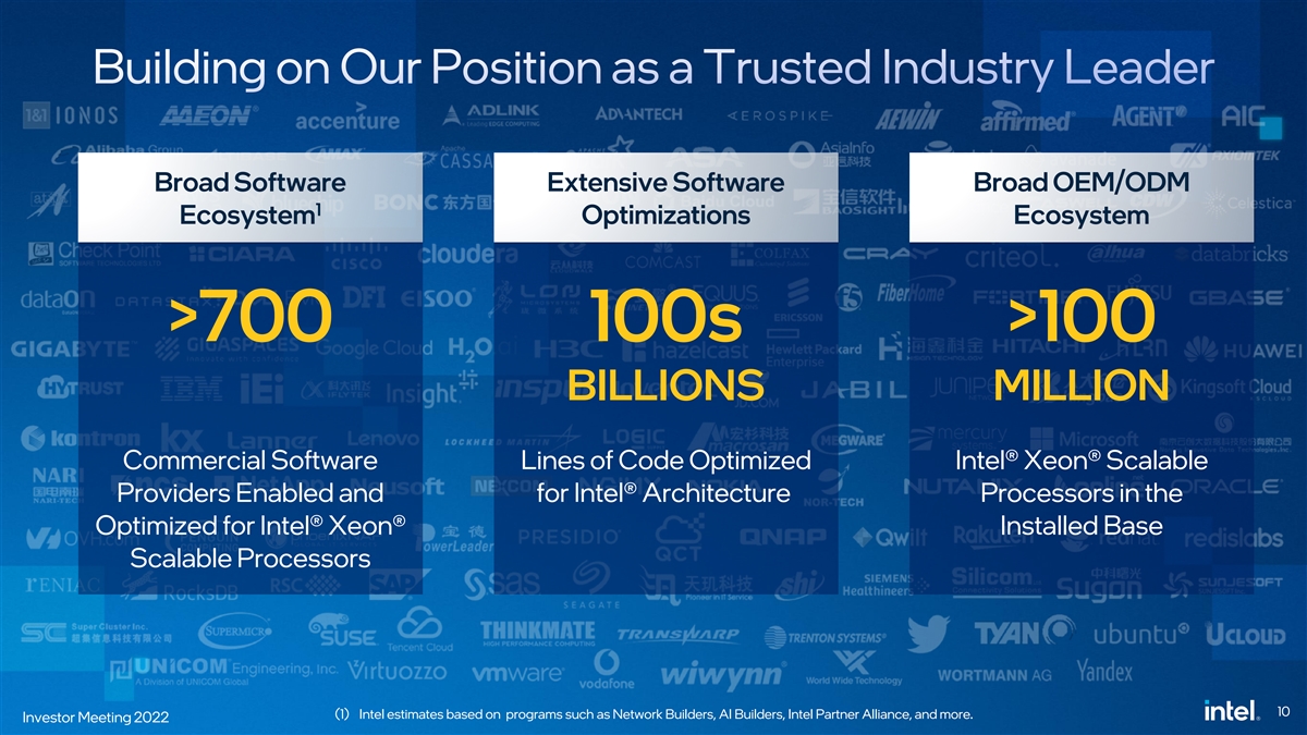 P- Core E-Core Perf/core optimized for mainstream & premium cloud and Emerald Rapids Sapphire Rapids Granite Rapids Future Gen data-center Intel 7 Intel 7 Intel 3 applications 2023 2022 2024 Power/perf optimized to support high- density, ultra- Sierra Forest efficient compute Future Gen Intel 3 for the cloud 2024 9 Investor Meeting 2022