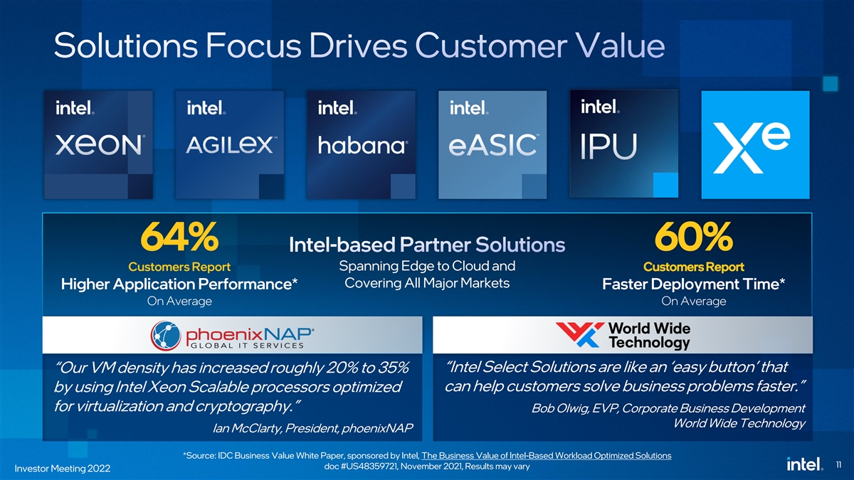 Broad Software Extensive Software Broad OEM/ODM 1 Ecosystem Optimizations Ecosystem >700 100s >100 BILLIONS MILLION Commercial Software Lines of Code Optimized Intel® Xeon® Scalable Providers Enabled and for Intel® Architecture Processors in the Optimized for Intel® Xeon® Installed Base Scalable Processors 10 (1) Intel estimates based on programs such as Network Builders, AI Builders, Intel Partner Alliance, and more. Investor Meeting 2022
