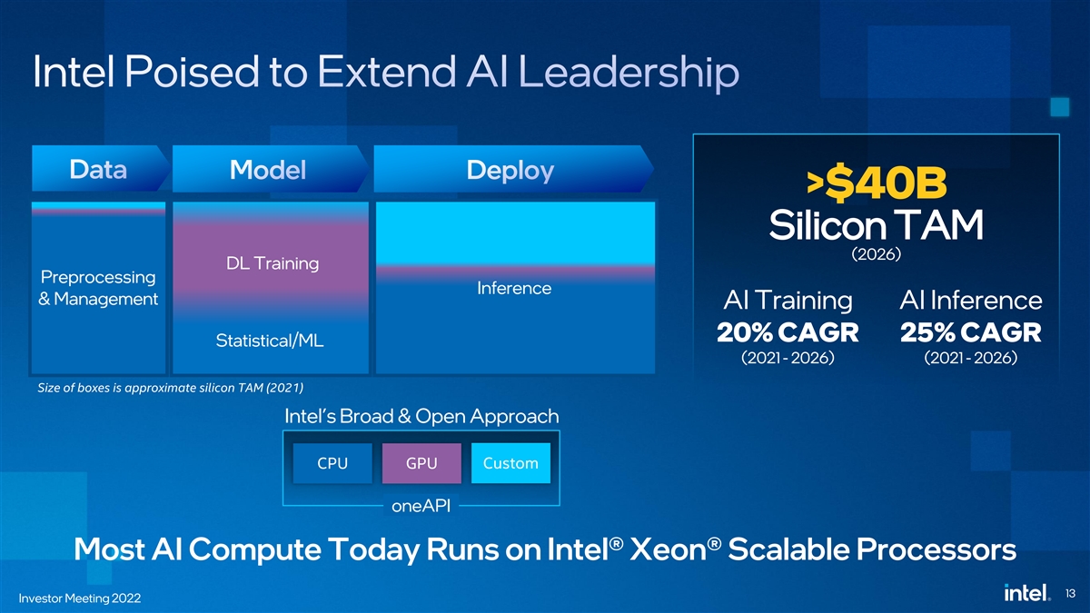 >$40B Silicon TAM (2026) DL Training Preprocessing Inference & Management AI Training AI Inference 20% CAGR 25% CAGR Statistical/ML (2021 - 2026) (2021 - 2026) Size of boxes is approximate silicon TAM (2021) Intel’s Broad & Open Approach CPU GPU Custom oneAPI Most AI Compute Today Runs on Intel® Xeon® Scalable Processors 13 Investor Meeting 2022