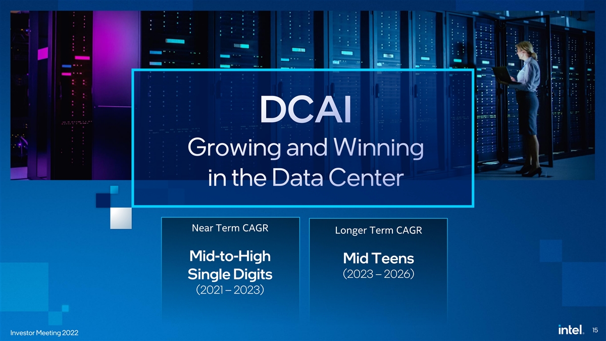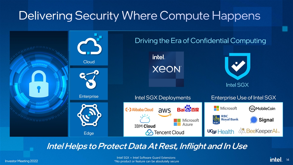 Driving the Era of Confidential Computing Cloud Intel SGX Enterprise Intel SGX Deployments Enterprise Use of Intel SGX Edge Intel Helps to Protect Data At Rest, Inflight and In Use Intel SGX = Intel Software Guard Extensions 14 Investor Meeting 2022 *No product or feature can be absolutely secure