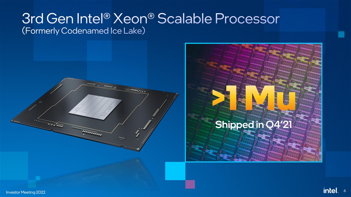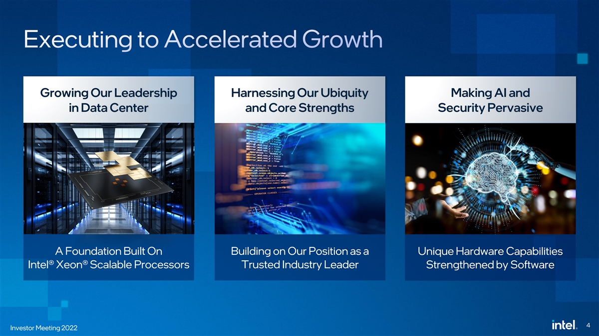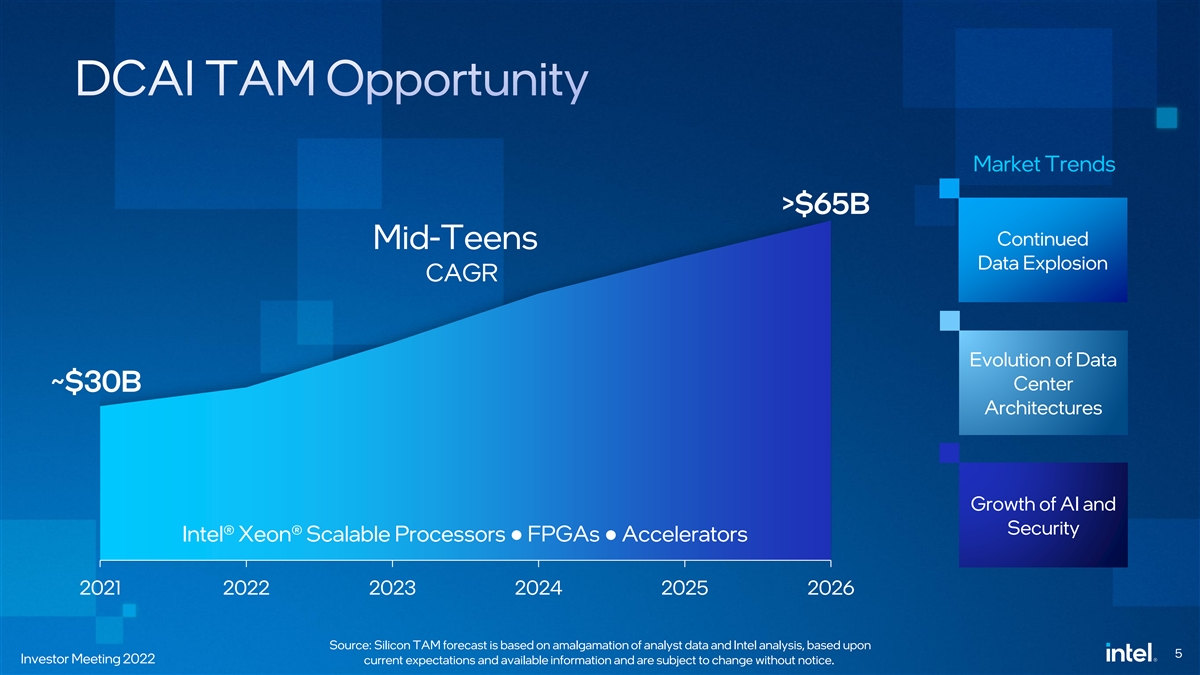 Market Trends >$65B Continued Mid-Teens Data Explosion CAGR Evolution of Data Center ~$30B Architectures Growth of AI and Security Intel® Xeon® Scalable Processors ● FPGAs ● Accelerators 2021 2022 2023 2024 2025 2026 Source: Silicon TAM forecast is based on amalgamation of analyst data and Intel analysis, based upon 5 Investor Meeting 2022 current expectations and available information and are subject to change without notice.