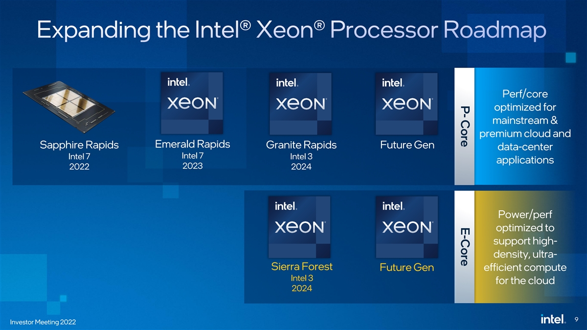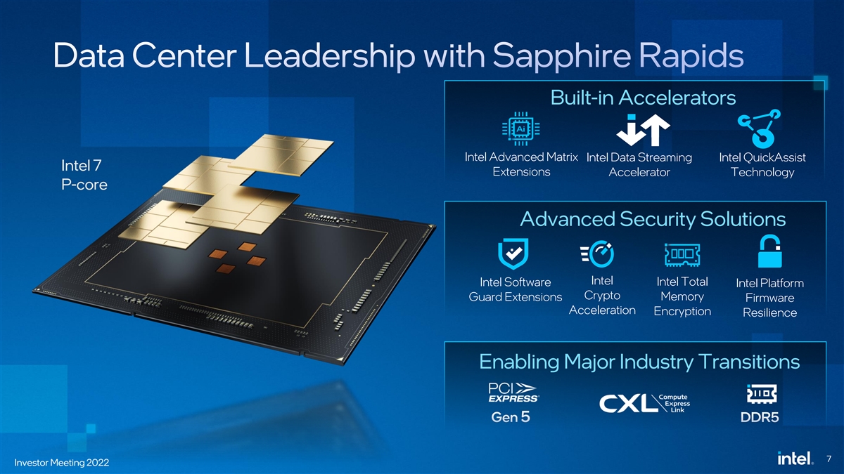Built-in Accelerators Intel Advanced Matrix Intel Data Streaming Intel QuickAssist Intel 7 Extensions Accelerator Technology P-core Advanced Security Solutions Intel Intel Software Intel Total Intel Platform Crypto Memory Guard Extensions Firmware Acceleration Encryption Resilience Enabling Major Industry Transitions 7 Investor Meeting 2022