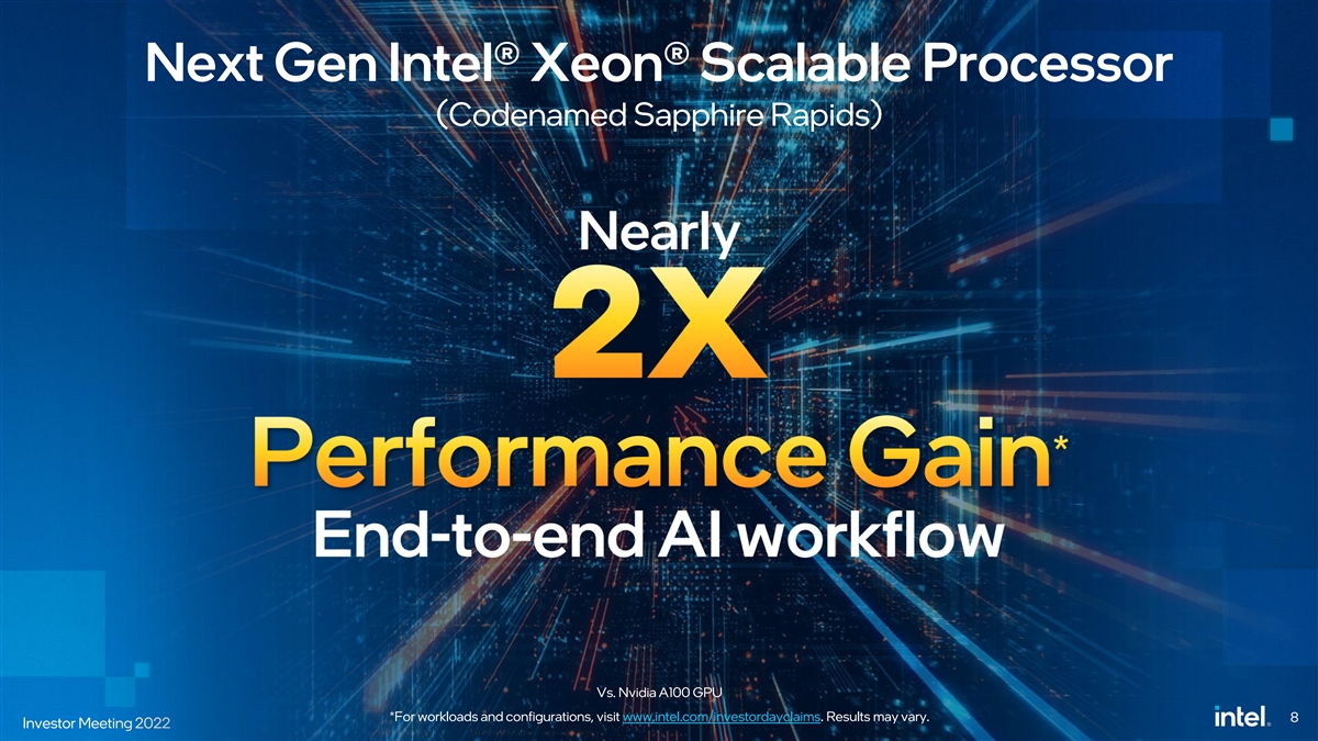 Next Gen Intel® Xeon® Scalable Processor (Codenamed Sapphire Rapids) Vs. Nvidia A100 GPU *For workloads and configurations, visit www.intel.com/investordayclaims. Results may vary. 8 Investor Meeting 2022