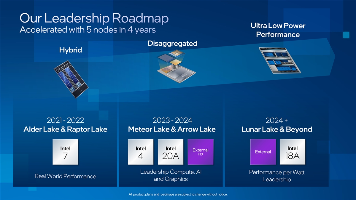 Hybrid 2021 - 2022 2023 - 2024 2024 + Alder Lake & Raptor Lake Meteor Lake & Arrow Lake Lunar Lake & Beyond Intel Intel Intel Intel External External N3 7 4 20A 18A All product plans and roadmaps are subject to change without notice.