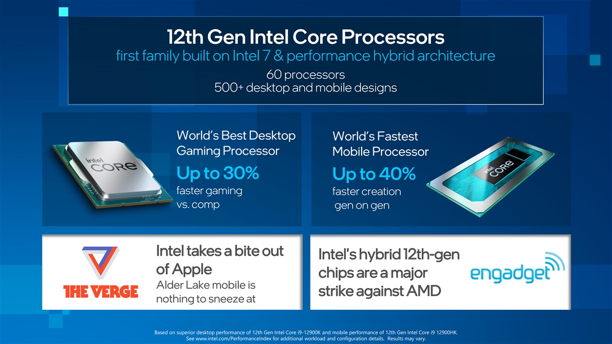 12th Gen Intel Core Processors first family built on Intel 7 & performance hybrid architecture 60 processors 500+ desktop and mobile designs World’s Best Desktop World’s Fastest Gaming Processor Mobile Processor Up to 30% Up to 40% faster gaming faster creation vs. comp gen on gen Intel takes a bite out Intel's hybrid 12th-gen of Apple chips are a major Alder Lake mobile is strike against AMD nothing to sneeze at Based on superior desktop performance of 12th Gen Intel Core i9-12900K and mobile performance of 12th Gen Intel Core i9 12900HK. See www.intel.com/PerformanceIndex for additional workload and configuration details. Results may vary.