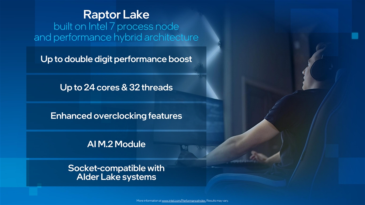 Raptor Lake built on Intel 7 process node and performance hybrid architecture Up to double digit performance boost Up to 24 cores & 32 threads Enhanced overclocking features AI M.2 Module Socket-compatible with Alder Lake systems More information at www.intel.com/PerformanceIndex. Results may vary.