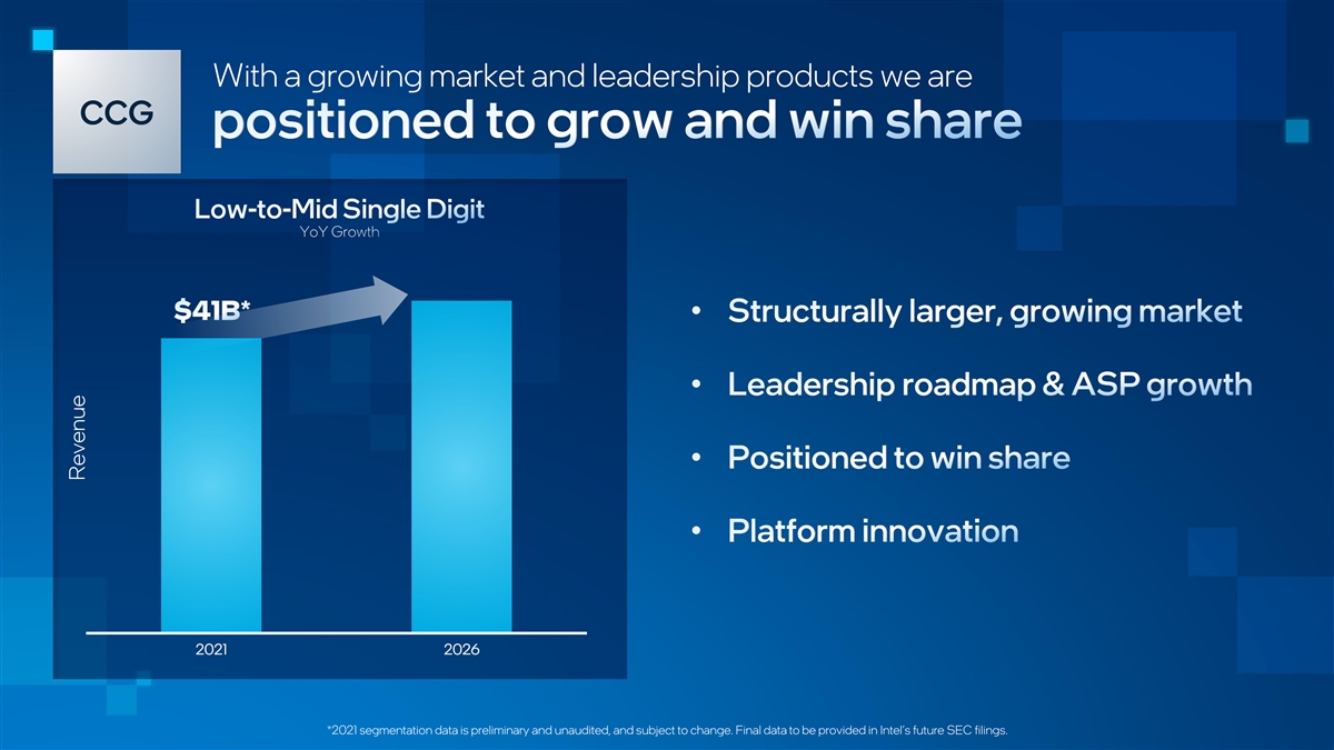 With a growing market and leadership products we are CCG 2021 2026 *2021 segmentation data is preliminary and unaudited, and subject to change. Final data to be provided in Intel’s future SEC filings. Revenue