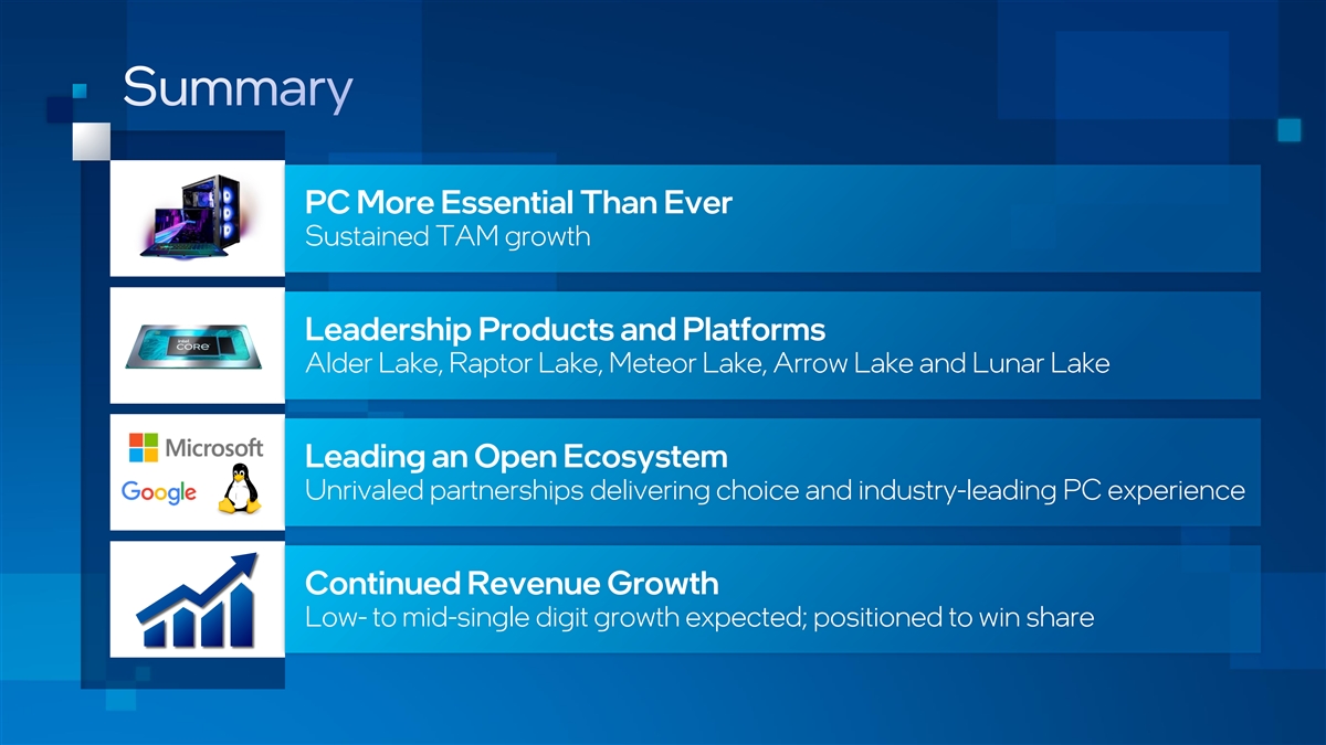 PC More Essential Than Ever Sustained TAM growth Leadership Products and Platforms Alder Lake, Raptor Lake, Meteor Lake, Arrow Lake and Lunar Lake Leading an Open Ecosystem Unrivaled partnerships delivering choice and industry-leading PC experience Continued Revenue Growth Low- to mid-single digit growth expected; positioned to win share