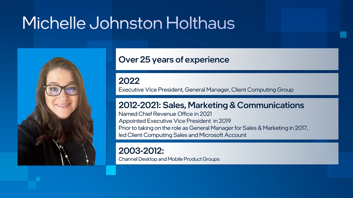Over 25 years of experience 2022 Executive Vice President, General Manager, Client Computing Group 2012-2021: Sales, Marketing & Communications Named Chief Revenue Office in 2021 Appointed Executive Vice President in 2019 Prior to taking on the role as General Manager for Sales & Marketing in 2017, led Client Computing Sales and Microsoft Account 2003-2012: Channel Desktop and Mobile Product Groups