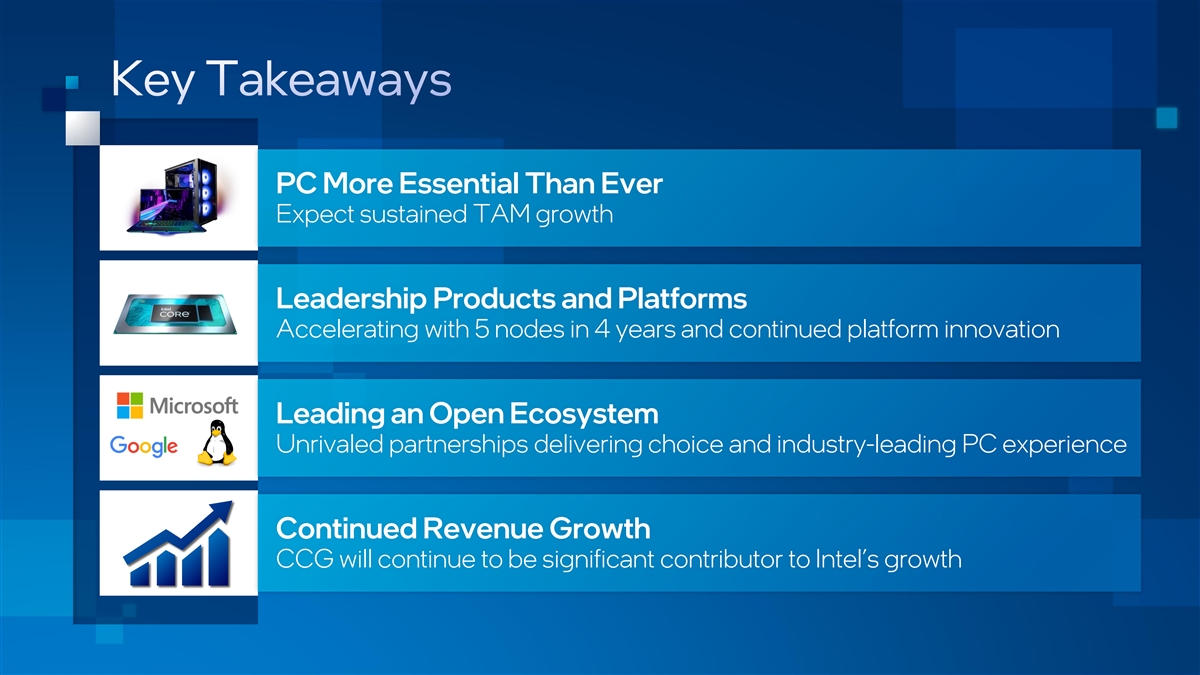 PC More Essential Than Ever Expect sustained TAM growth Leadership Products and Platforms Accelerating with 5 nodes in 4 years and continued platform innovation Leading an Open Ecosystem Unrivaled partnerships delivering choice and industry-leading PC experience Continued Revenue Growth CCG will continue to be significant contributor to Intel’s growth