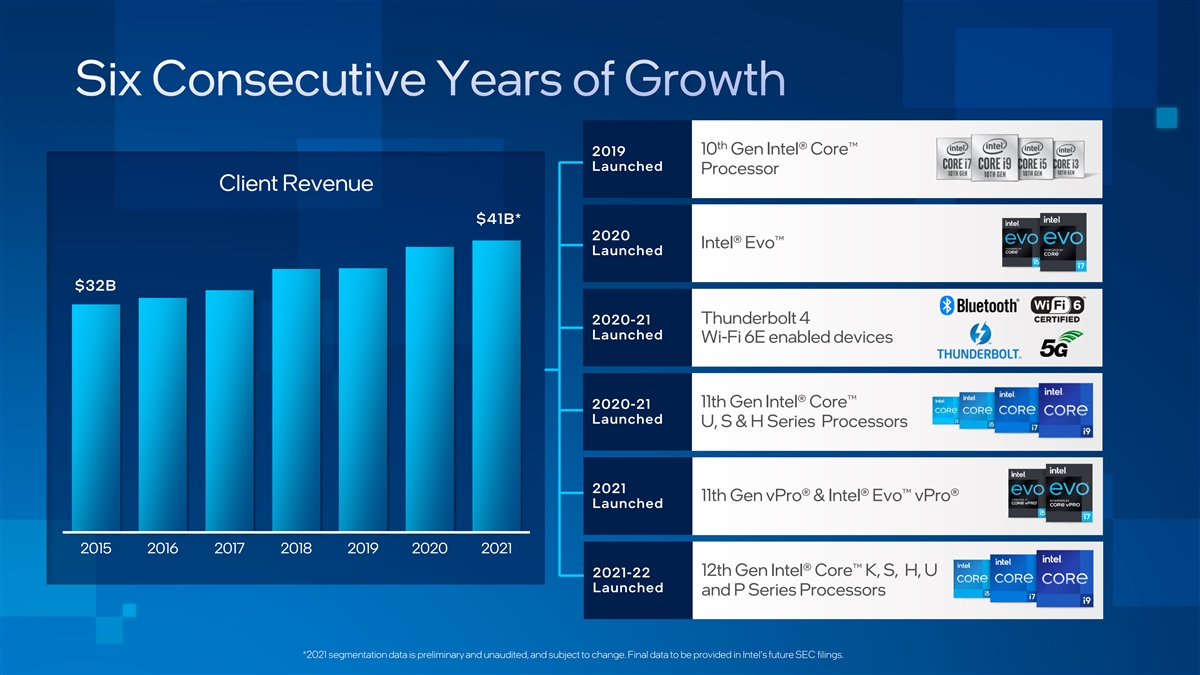 th 10 Gen Intel® Core™ 2 019 La unched Processor Client Revenue $41B* 2 02 0 Intel® Evo™ La unched $32B 2020 Thunderbolt 4 2 02 0-21 La unched Wi-Fi 6E enabled devices 11th Gen Intel® Core™ 2 02 0-21 La unched U, S & H Series Processors 2 02 1 11th Gen vPro® & Intel® Evo™ vPro® La unched 2015 2016 2017 2018 2019 2020 2021 12th Gen Intel® Core™ K, S, H, U 2 02 1-22 La unched and P Series Processors *2021 segmentation data is preliminary and unaudited, and subject to change. Final data to be provided in Intel’s future SEC filings.