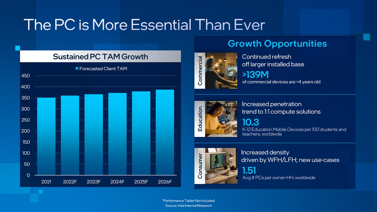 Growth Opportunities Continued refresh Sustained PC TAM Growth off larger installed base Forecasted Client TAM 450 >139M of commercial devices are >4 years old 400 350 Increased penetration 300 trend to 1:1 compute solutions 250 10.3 K-12 Education Mobile Devices per 100 students and 200 teachers, worldwide 150 Increased density 100 driven by WFH/LFH; new use-cases 50 1.51 0 Avg # PCs per owner-HH, worldwide 2021 2022F 2023F 2024F 2025F 2026F *Performance Tablet Not Included Source: Intel Internal Research Consumer Education Commercial