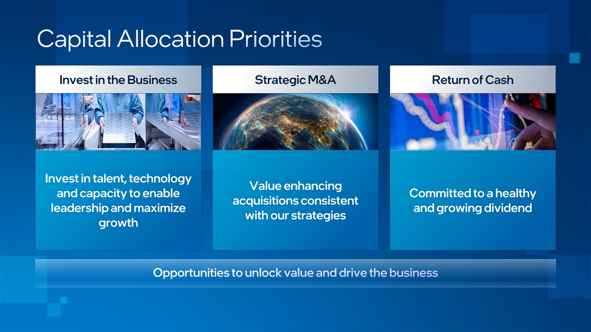 Invest in the Business Strategic M&A Return of Cash Invest in talent, technology Value enhancing and capacity to enable Committed to a healthy acquisitions consistent leadership and maximize and growing dividend with our strategies growth