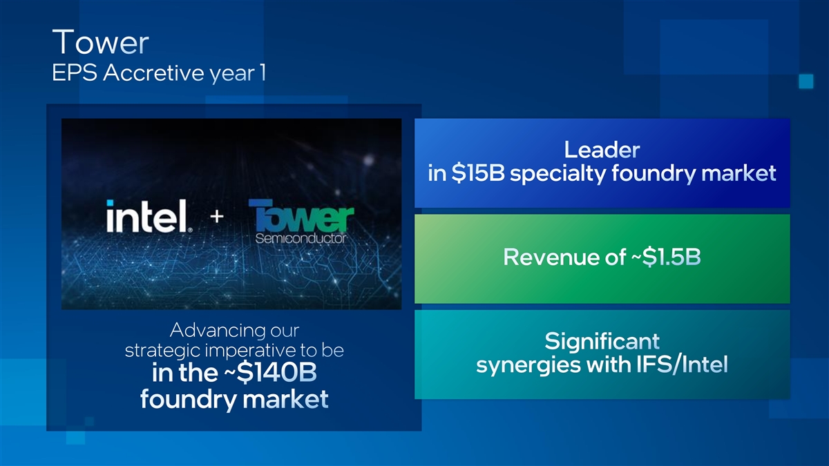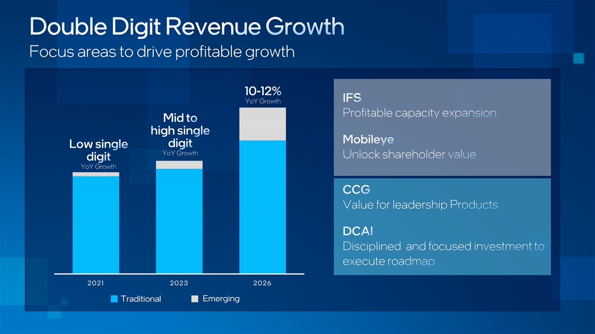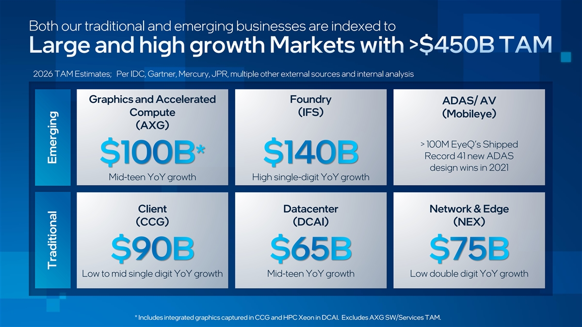 Both our traditional and emerging businesses are indexed to 2026 TAM Estimates; Per IDC, Gartner, Mercury, JPR, multiple other external sources and internal analysis Graphics and Accelerated Foundry ADAS/ AV Compute (IFS) (Mobileye) (AXG) > 100M EyeQ’s Shipped Record 41 new ADAS design wins in 2021 Mid-teen YoY growth High single-digit YoY growth Client Datacenter Network & Edge (CCG) (DCAI) (NEX) Low to mid single digit YoY growth Mid-teen YoY growth Low double digit YoY growth * Includes integrated graphics captured in CCG and HPC Xeon in DCAI. Excludes AXG SW/Services TAM. Traditional Emerging