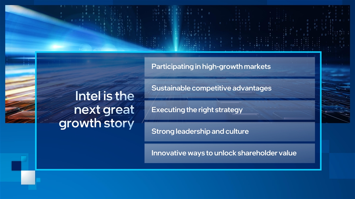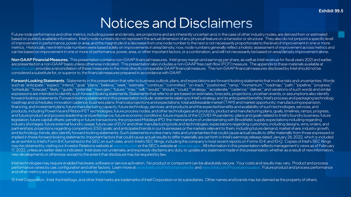 Exhibit 99.5 Future node performance and other metrics, including power and density, are projections and are inherently uncertain and, in the case of other industry nodes, are derived from or estimated based on publicly available information. Intel’s node numbers do not represent the actual dimension of any physical feature on a transistor or structure. They also do not pinpoint a specific level of improvement in performance, power or area, and the magnitude of a decrease from one node number to the next is not necessarily proportionate to the level of improvement in one or more metrics. Historically, new Intel node numbers were based solely on improvements in area/density; now, node numbers generally reflect a holistic assessment of improvement across metrics and can be based on improvement in one or more of performance, power, area, or other important factors, or a combination, and will not necessarily be based on area/density improvement alone. Non-GAAP Financial Measures. This presentation contains non-GAAP financial measures. Intel gross margin and earnings per share, as well as Intel revenue for fiscal years 2021 and earlier, are presented on a non-GAAP basis unless otherwise indicated. This presentation also includes a non-GAAP free cash flow (FCF) measure. The appendix to these materials available at www.intc.com provides a reconciliation of these measures to the most directly comparable GAAP financial measure. The non-GAAP financial measures disclosed by Intel should not be considered a substitute for, or superior to, the financial measures prepared in accordance with GAAP. Forward-Looking Statements. Statements in this presentation that refer to business outlook, plans, and expectations are forward-looking statements that involve risks and uncertainties. Words such as anticipate, expect, intend, goal, plans, believe, seek, estimate, continue,“ “committed,” “on-track,” ”positioned,” “ramp,” “momentum,” “roadmap,” “path,” “pipeline,” “progress,” “schedule,” “forecast,” “likely,” “guide,” “potential,” “next gen,” “future,” may, will, “would,” should, “could,” strategy, accelerate, cadence, deliver, and variations of such words and similar expressions are intended to identify such forward-looking statements. Statements that refer to or are based on estimates, forecasts, projections, uncertain events, or assumptions also identify forward-looking statements. Forward-looking statements in this presentation include: statements relating to Intel’s strategy and its anticipated benefits; Intel's process and packaging technology roadmap and schedules; innovation cadence; business plans; financial projections and expectations; total addressable market (TAM) and market opportunity; manufacturing expansion, financing, and investment plans; future manufacturing capacity; future technology, services, and products and the expected benefits and availability of such technologies, services, and products, including PowerVia and RibbonFET technologies, future process nodes, and other technologies and products; product and manufacturing plans, goals, timelines, ramps, progress, and future product and process leadership and performance; future economic conditions; future impacts of the COVID-19 pandemic; plans and goals related to Intel’s foundry business; future legislation; future capital offsets; pending or future transactions; the proposed Mobileye IPO; the memorandum of understanding with Brookfield; supply expectations including regarding industry shortages; future external foundry usage; future use of EUV and other manufacturing tools and technologies; expectations regarding customers, including designs, wins, orders, and partnerships; projections regarding competitors; ESG goals; and anticipated trends in our businesses or the markets relevant to them, including future demand, market share, industry growth, and technology trends, also identify forward-looking statements. Such statements involve many risks and uncertainties that could cause actual results to differ materially from those expressed or implied in these forward-looking statements. Important factors that could cause actual results to differ materially are set forth in Intel's earnings release dated January 26, 2022, which is included as an exhibit to Intel’s Form 8-K furnished to the SEC on such date, and in Intel's SEC filings, including the company's most recent reports on Forms 10-K and 10-Q. Copies of Intel’s SEC filings may be obtained by visiting our Investor Relations website at www.intc.com or the SEC's website at www.sec.gov. All information in this presentation reflects management’s views as of February 17, 2022, unless an earlier date is indicated. Intel does not undertake, and expressly disclaims any duty, to update any statement made in this presentation, whether as a result of new information, new developments or otherwise, except to the extent that disclosure may be required by law. Intel technologies may require enabled hardware, software or service activation. No product or component can be absolutely secure. Your costs and results may vary. Product and process performance varies by use, configuration and other factors. Learn more at www.Intel.com/PerformanceIndex and www.Intel.com/ProcessInnovation. Future product and process performance and other metrics are projections and are inherently uncertain. © Intel Corporation. Intel, the Intel logo, and other Intel marks are trademarks of Intel Corporation or its subsidiaries. Other names and brands may be claimed as the property of others.