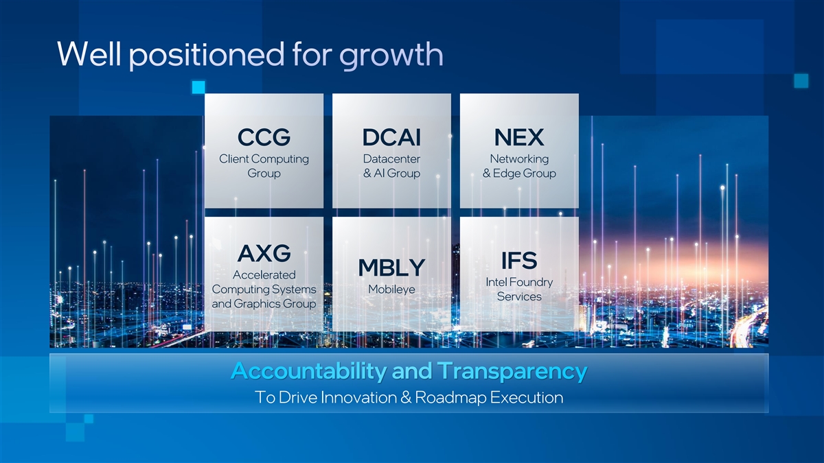 CCG DCAI NEX Client Computing Datacenter Networking Group & AI Group & Edge Group AXG IFS MBLY Accelerated Intel Foundry Computing Systems Mobileye Services and Graphics Group To Drive Innovation & Roadmap Execution