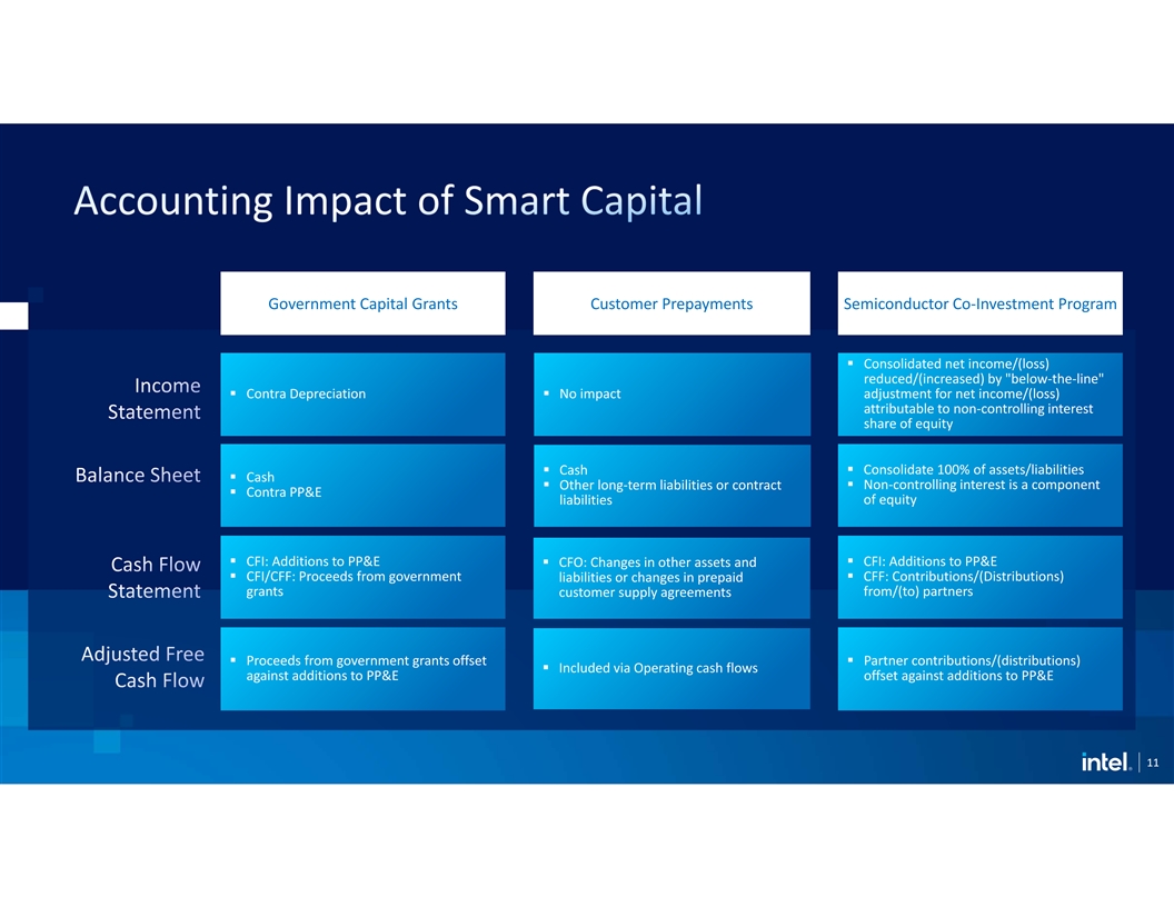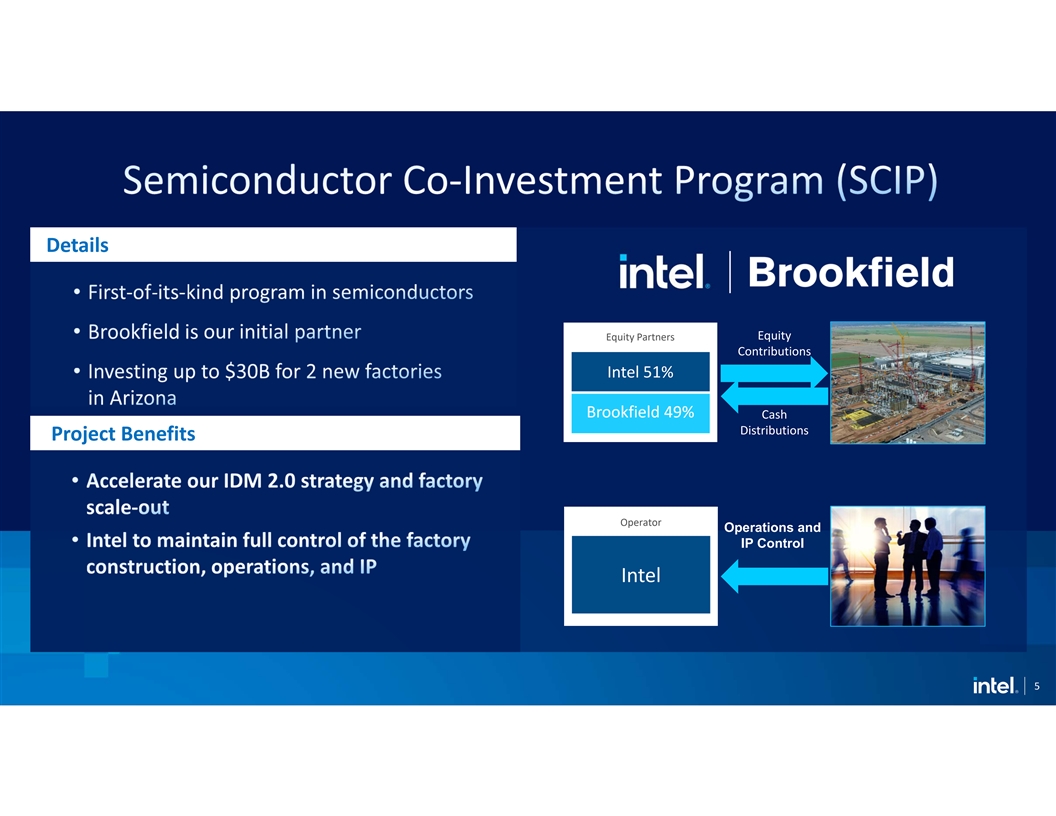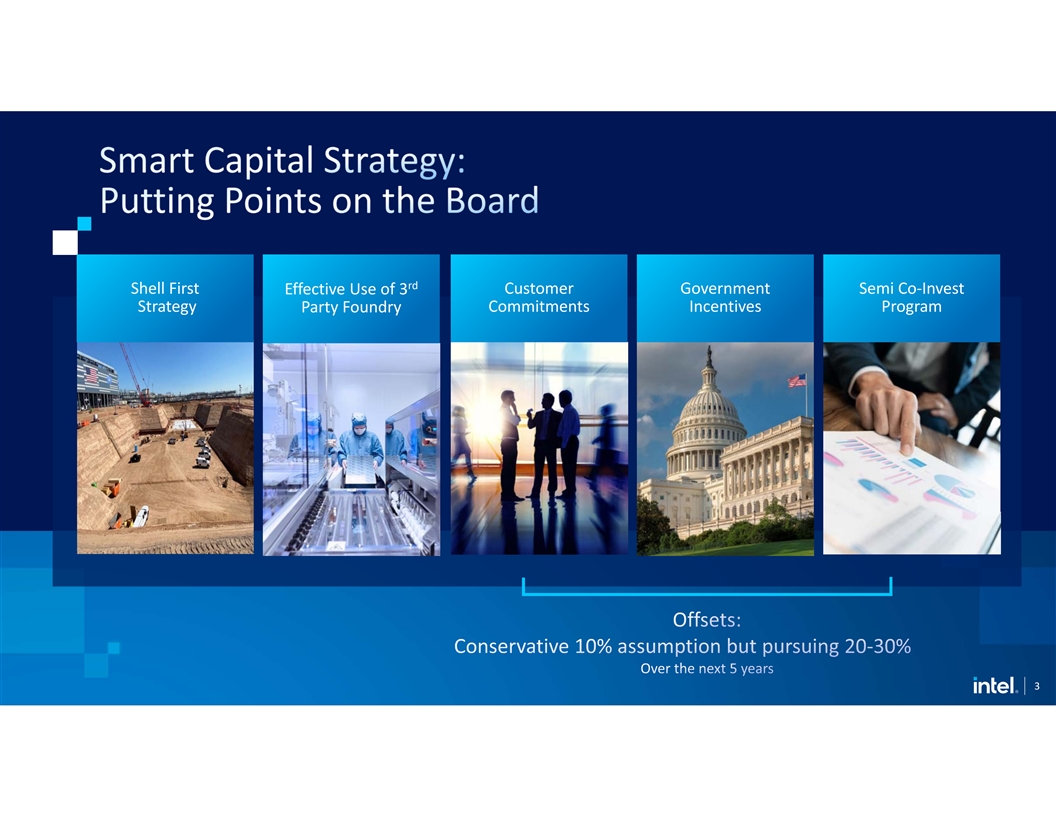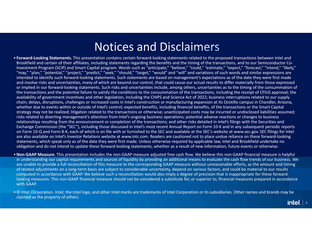 • Forward‐Looking Statements. This presentation contains certain forward‐looking statements related to the proposed transactions between Intel and Brookfield and certain of their affiliates, including statements regarding the benefits and the timing of the transactions, and to our Semiconductor Co‐ Investment Program (SCIP) and Smart Capital program. Words such as “anticipate,” “believe,” “could,” “estimate,” “expect,” “forecast,” “intend,” “likely,” “may,” “plan,” “potential,” “project,” “predict,” “seek,” “should,” “target,” “would” and “will” and variations of such words and similar expressions are intended to identify such forward‐looking statements. Such statements are based on management’s expectations as of the date they were first made and involve risks and uncertainties, many of which are beyond our control, that could cause our actual results to differ materially from those expressed or implied in our forward‐looking statements. Such risks and uncertainties include, among others, uncertainties as to the timing of the consummation of the transactions and the potential failure to satisfy the conditions to the consummation of the transactions, including the receipt of CFIUS approval; the availability of government incentives and other legislation, including the CHIPS and Science Act of 2022; business interruptions related to our supply chain; delays, disruptions, challenges or increased costs in Intel’s construction or manufacturing expansion at its Ocotillo campus in Chandler, Arizona, whether due to events within or outside of Intel’s control; expected benefits, including financial benefits, of the transactions or the Smart Capital strategy may not be realized; litigation related to the transactions or otherwise; unanticipated costs may be incurred or undisclosed liabilities assumed; risks related to diverting management’s attention from Intel’s ongoing business operations; potential adverse reactions or changes to business relationships resulting from the announcement or completion of the transactions; and other risks detailed in Intel’s filings with the Securities and Exchange Commission (the “SEC”), including those discussed in Intel’s most recent Annual Report on Form 10‐K and in any subsequent periodic reports on Form 10‐Q and Form 8‐K, each of which is on file with or furnished to the SEC and available at the SEC’s website at www.sec.gov. SEC filings for Intel are also available on Intel’s Investor Relations website at www.intc.com. Readers are cautioned not to place undue reliance on these forward‐looking statements, which speak only as of the date they were first made. Unless otherwise required by applicable law, Intel and Brookfield undertake no obligation and do not intend to update these forward‐looking statements, whether as a result of new information, future events or otherwise. • Non‐GAAP Measure. This presentation includes the non‐GAAP measure adjusted free cash flow. We believe this non‐GAAP financial measure is helpful in understanding our capital requirements and sources of liquidity by providing an additional means to evaluate the cash flow trends of our business. We are unable to provide a full reconciliation of this measure to the corresponding GAAP measure without unreasonable efforts, as the amount and timing of related adjustments on a long‐term basis are subject to considerable uncertainty, depend on various factors, and could be material to our results computed in accordance with GAAP. We believe such a reconciliation would also imply a degree of precision that is inappropriate for these forward‐ looking measures. This non‐GAAP financial measure should not be considered a substitute for, or superior to, financial measures prepared in accordance with GAAP. • © Intel Corporation. Intel, the Intel logo, and other Intel marks are trademarks of Intel Corporation or its subsidiaries. Other names and brands may be claimed as the property of others. 2