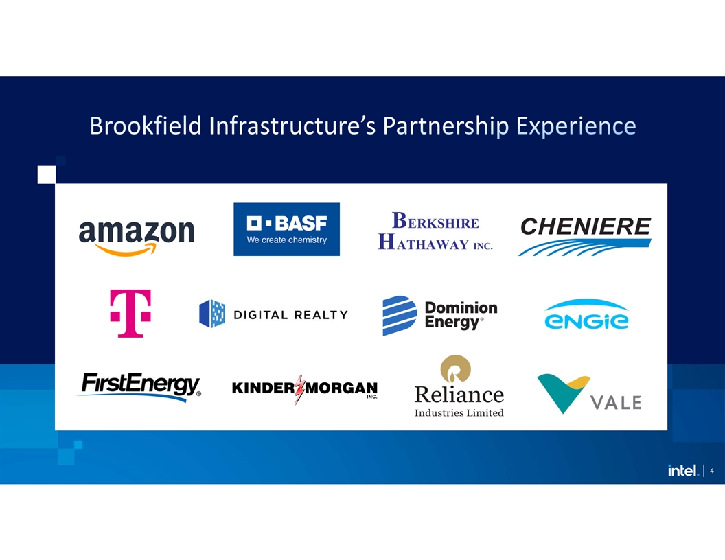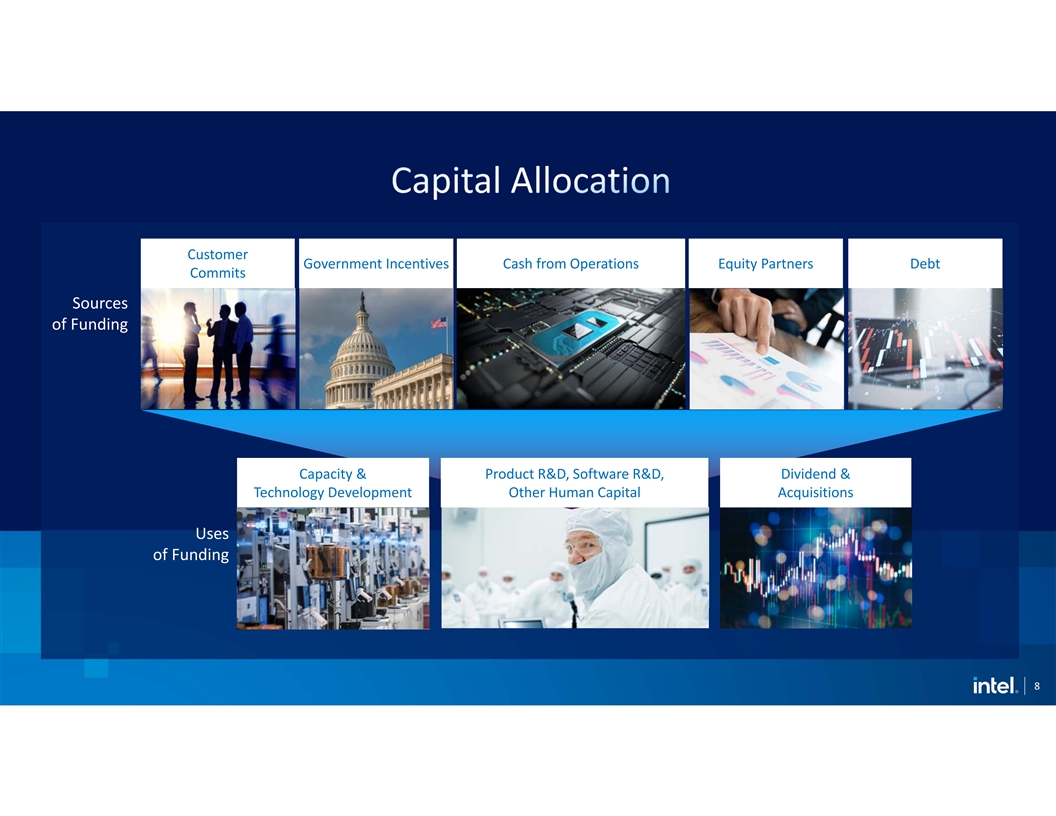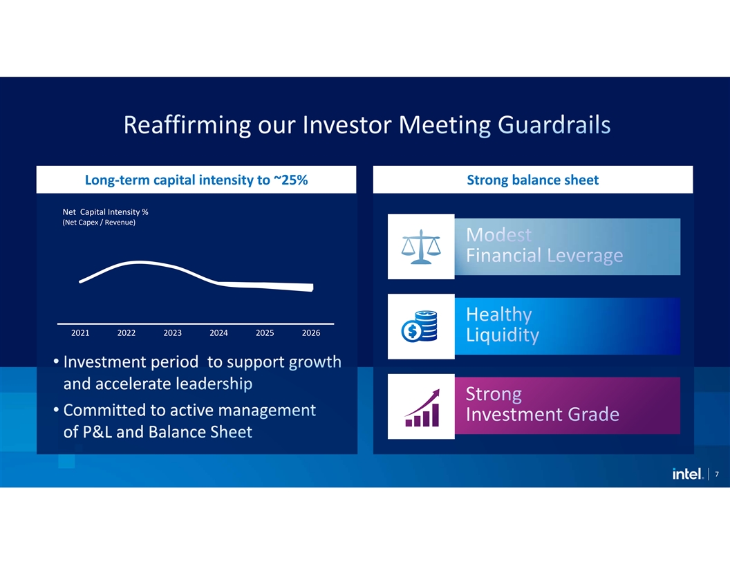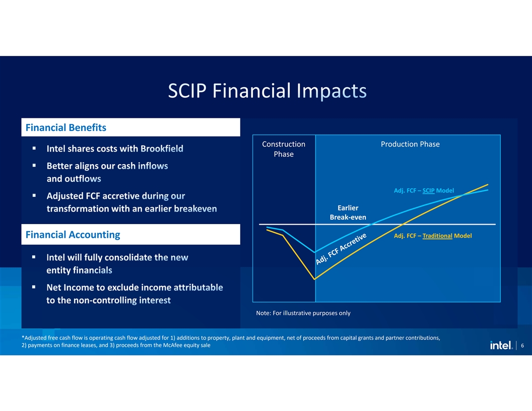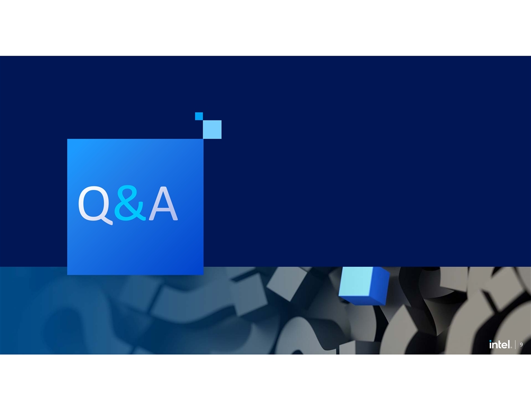 • Forward‐Looking Statements. This presentation contains certain forward‐looking statements related to the proposed transactions between Intel and Brookfield and certain of their affiliates, including statements regarding the benefits and the timing of the transactions, and to our Semiconductor Co‐ Investment Program (SCIP) and Smart Capital program. Words such as “anticipate,” “believe,” “could,” “estimate,” “expect,” “forecast,” “intend,” “likely,” “may,” “plan,” “potential,” “project,” “predict,” “seek,” “should,” “target,” “would” and “will” and variations of such words and similar expressions are intended to identify such forward‐looking statements. Such statements are based on management’s expectations as of the date they were first made and involve risks and uncertainties, many of which are beyond our control, that could cause our actual results to differ materially from those expressed or implied in our forward‐looking statements. Such risks and uncertainties include, among others, uncertainties as to the timing of the consummation of the transactions and the potential failure to satisfy the conditions to the consummation of the transactions, including the receipt of CFIUS approval; the availability of government incentives and other legislation, including the CHIPS and Science Act of 2022; business interruptions related to our supply chain; delays, disruptions, challenges or increased costs in Intel’s construction or manufacturing expansion at its Ocotillo campus in Chandler, Arizona, whether due to events within or outside of Intel’s control; expected benefits, including financial benefits, of the transactions or the Smart Capital strategy may not be realized; litigation related to the transactions or otherwise; unanticipated costs may be incurred or undisclosed liabilities assumed; risks related to diverting management’s attention from Intel’s ongoing business operations; potential adverse reactions or changes to business relationships resulting from the announcement or completion of the transactions; and other risks detailed in Intel’s filings with the Securities and Exchange Commission (the “SEC”), including those discussed in Intel’s most recent Annual Report on Form 10‐K and in any subsequent periodic reports on Form 10‐Q and Form 8‐K, each of which is on file with or furnished to the SEC and available at the SEC’s website at www.sec.gov. SEC filings for Intel are also available on Intel’s Investor Relations website at www.intc.com. Readers are cautioned not to place undue reliance on these forward‐looking statements, which speak only as of the date they were first made. Unless otherwise required by applicable law, Intel and Brookfield undertake no obligation and do not intend to update these forward‐looking statements, whether as a result of new information, future events or otherwise. • Non‐GAAP Measure. This presentation includes the non‐GAAP measure adjusted free cash flow. We believe this non‐GAAP financial measure is helpful in understanding our capital requirements and sources of liquidity by providing an additional means to evaluate the cash flow trends of our business. We are unable to provide a full reconciliation of this measure to the corresponding GAAP measure without unreasonable efforts, as the amount and timing of related adjustments on a long‐term basis are subject to considerable uncertainty, depend on various factors, and could be material to our results computed in accordance with GAAP. We believe such a reconciliation would also imply a degree of precision that is inappropriate for these forward‐ looking measures. This non‐GAAP financial measure should not be considered a substitute for, or superior to, financial measures prepared in accordance with GAAP. • © Intel Corporation. Intel, the Intel logo, and other Intel marks are trademarks of Intel Corporation or its subsidiaries. Other names and brands may be claimed as the property of others. 2
